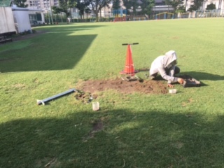 朝活はサッチの目立つ土部分、バックネット前の補植。