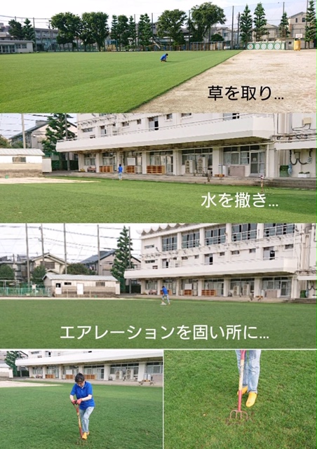 昨日28日は雨天のため、活動はお休みしました。今朝は晴れていたので点検をしました。ビッグロールを敷設したところの芝は中に茶色い枯れた芝が残っているので、掻き出す・・・?